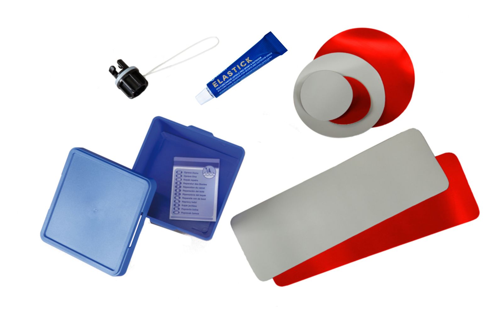 Složení: tuba 15g s lepidlem, náhradní záplaty, upravená redukce push-push ventilu, šroub s maticí na sedačky.