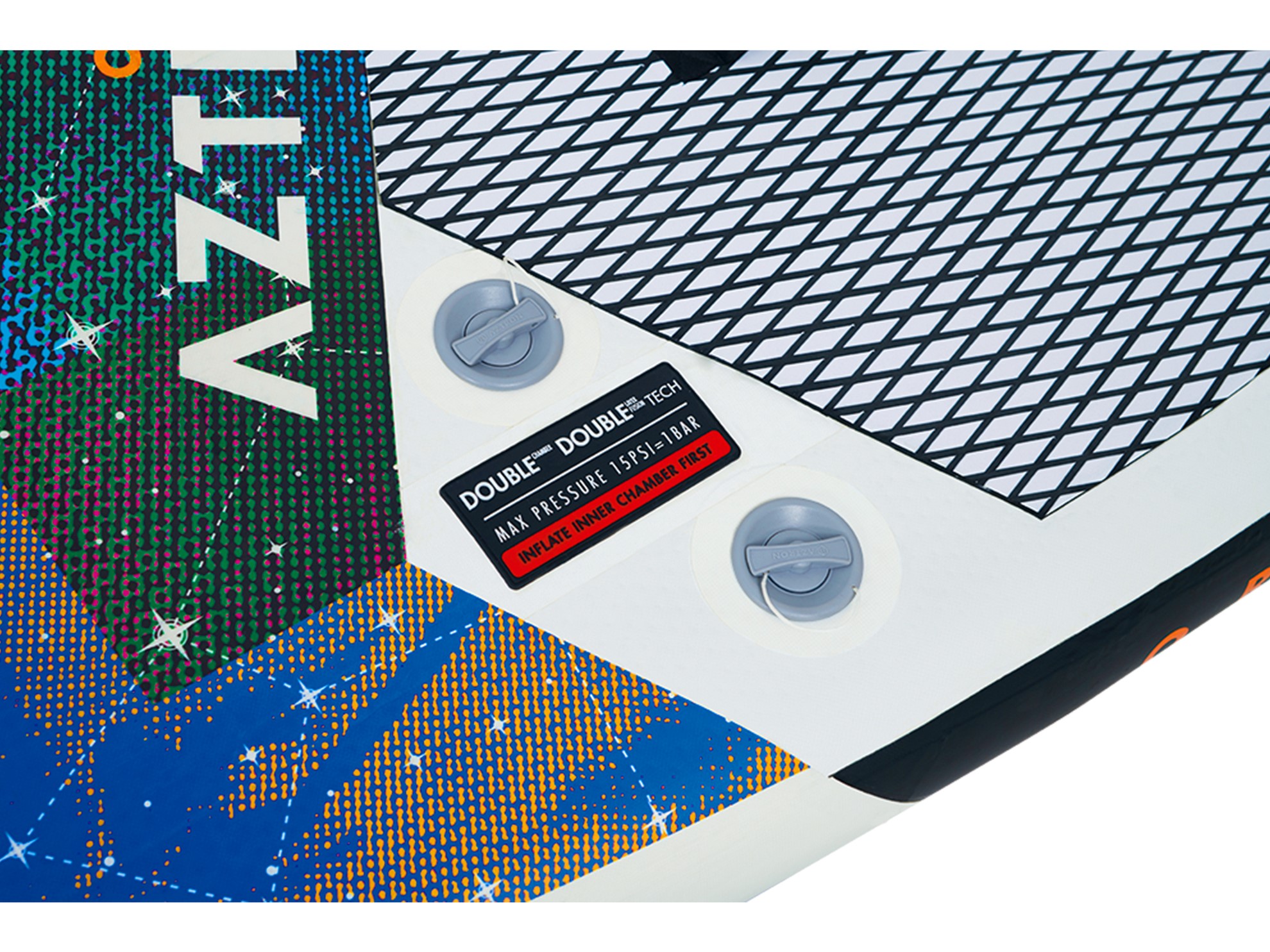 - Vysokotlaký dvouventilový systém: Paddleboard Aztron Orion je vybaven vlastními duálními vysokotlakými ventily, které předcházejí poškození přehuštěním.