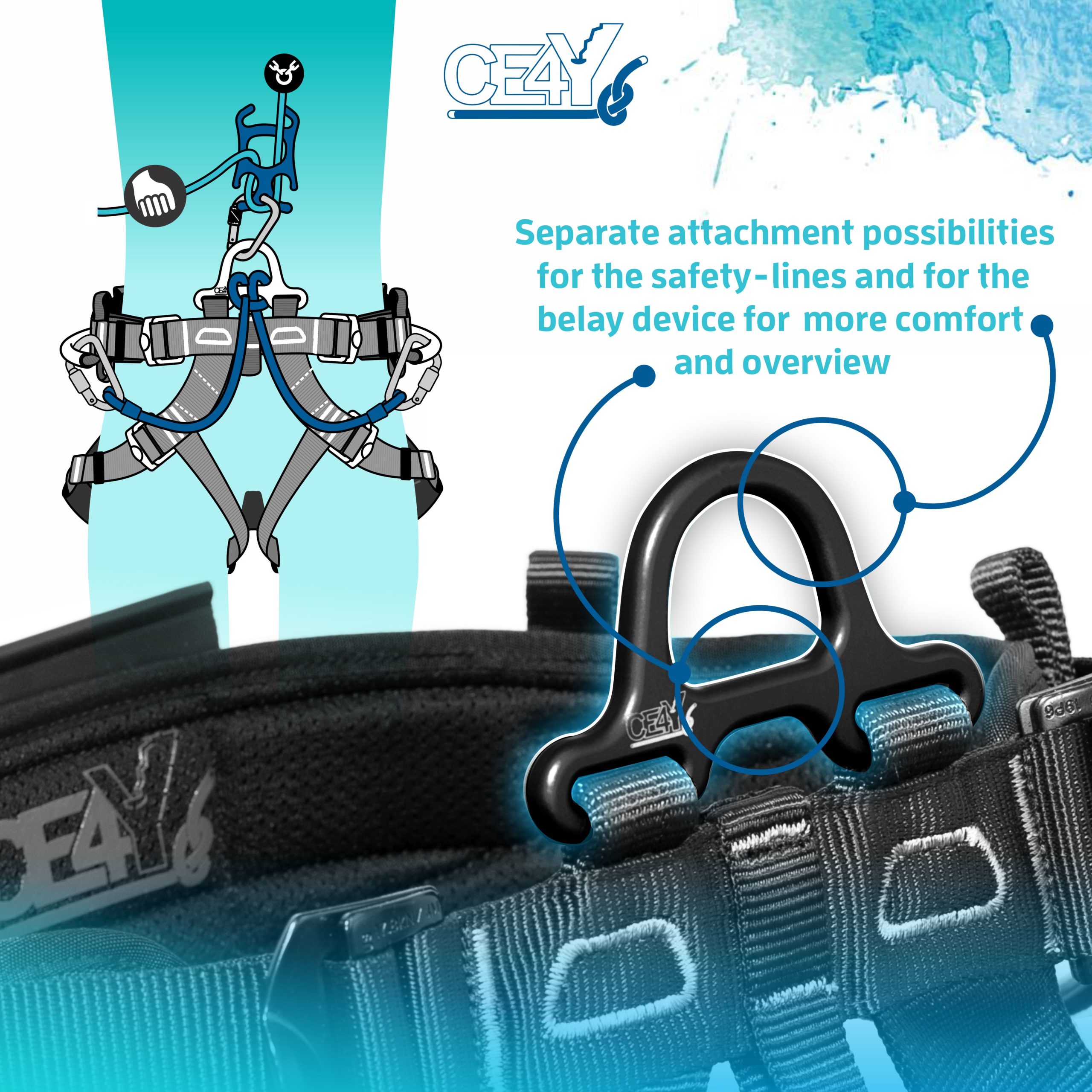 - 4 spony umožňují optimální a snadné nastavení a místo pro připojení lana zůstává vždy uprostřed